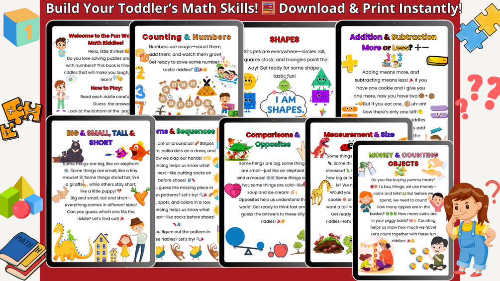 Give your child a head start in math with this fun and interactive riddle book! 🌟 Designed for toddlers and preschoolers (ages 3-5), this book has clever riddles that make learning numbers, shapes, counting, and patterns exciting and playful! 🧮✨